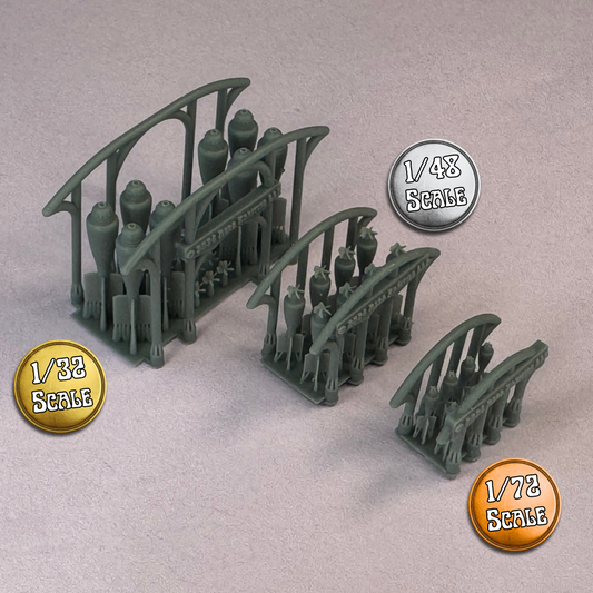 Bring your favorite builds to completion with our unique range of super-detailed aerial bombs in 1/32, 1/48, and 1/72 scale. Included in this collection is nearly every light bomb used by Britain's Royal Flying Corps, Royal Naval Air Service, Royal Air Force and Independent Air Force during WW1.